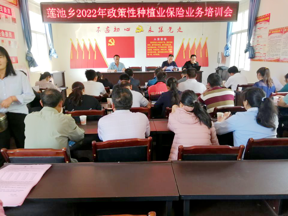 为了顺利推进2022年政策性农业保险工作,确保惠农政策落到实处,保护农民利益。5月7日下午,莲池乡在羊旧乍村召开2022年政策性农业保险工作启动暨业务培训会,分管农业工作副乡长、农业农村服务中心全体职工、中国平安财产保险股份有限公司永仁支公司业务人员、6个村委会(书记)主任、村“三农”保险联络员共20余人参加了会议。