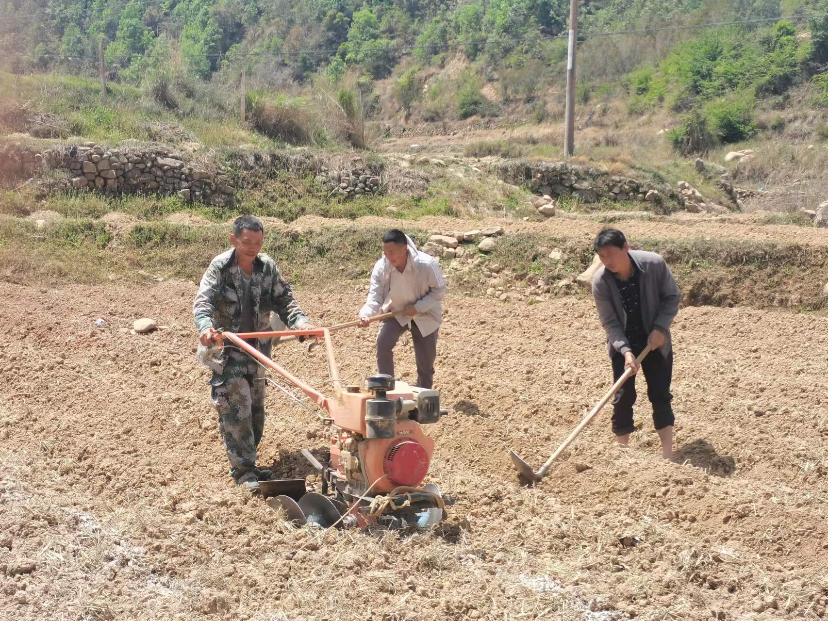 村民刘国祥驾驶着微耕机,来回间,地里便隆起一条条笔直的垄埂。