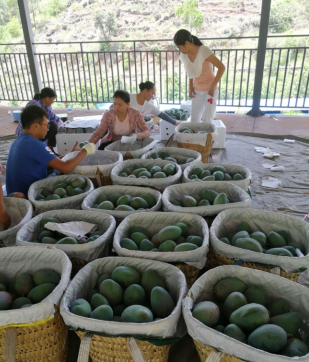 走进拉姑村,成熟的芒果一个挨着一个挂满了枝头,果农们正忙碌着采摘,一派丰收景象。王科富是当地规模化种植芒果的带头人之一,如今全村芒果种植已发展到5000多亩,他通过到外地参观学习、调查市场,先行先试,带头种植。在此基础上,拉姑村成立了芒果种植专业合作社,现在已有183户农户加入。在种植过程中,合作社要求社员一律采用农家肥,必须套袋防虫,让芒果在精心呵护下自然成熟。成熟后的芒果个头大、外观美、味道好。