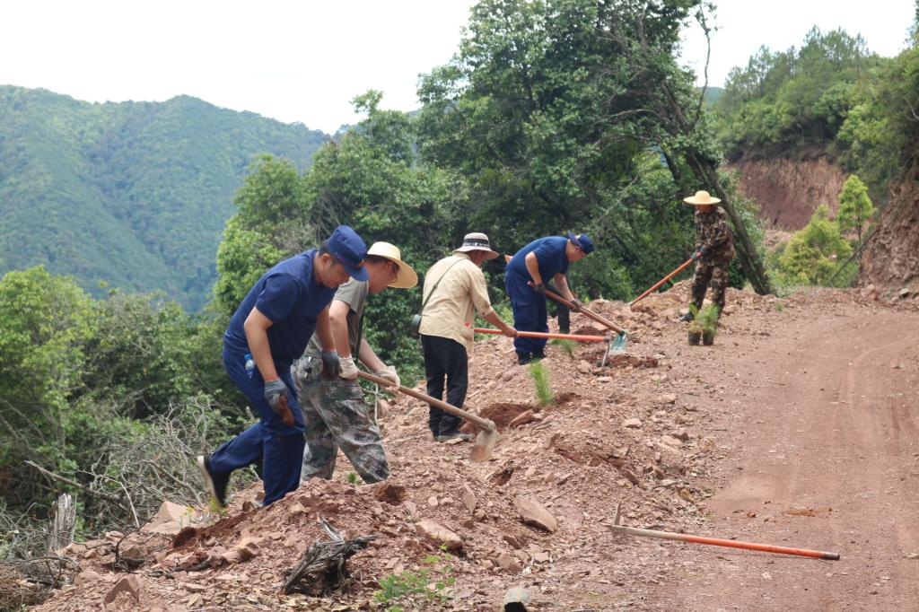 会议结束后,大家热情高涨,前往直苴村委会黑泥拉生态修复基地开展义务植树活动。植树现场,党员干部群众分工协作、分组植树,大家拿起锄头、铁楸、水桶等劳动工具,在专业人员的指导下,挖坑铲土、扶苗培土、撒籽浇水,认真完成每道工序,现场一派热火朝天的劳动景象。经过4个多小时的努力,原本光秃秃的道路旁,添上了绿意,看着迎风挺立的树苗,大家顿感成就满满。