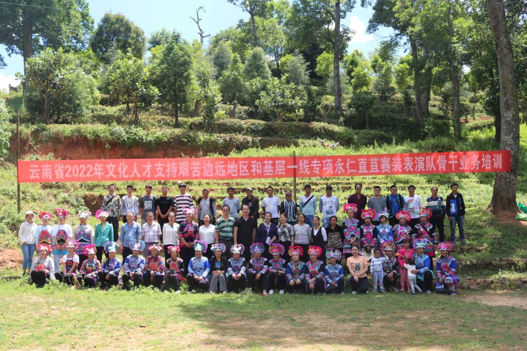 7月14日下午,由云南省文化艺术中心、楚雄州文化和旅游局主办,永仁县人民政府承办,永仁县文化和旅游局、中和镇人民政府协办的“云南省2022年文化人才支持艰苦边远地区和基层一线专项永仁直苴赛装 表演队骨干业务培训班”在直苴村赛装广场正式开班。楚雄州文化馆馆长张留福,楚雄州艺术剧院国家一级编导马云祥,永仁县文化和旅游局党组书记、局长彭莉等县镇领导及工作人员,直苴村107名文艺骨干代表参加开班仪式。