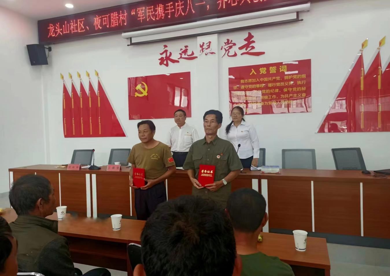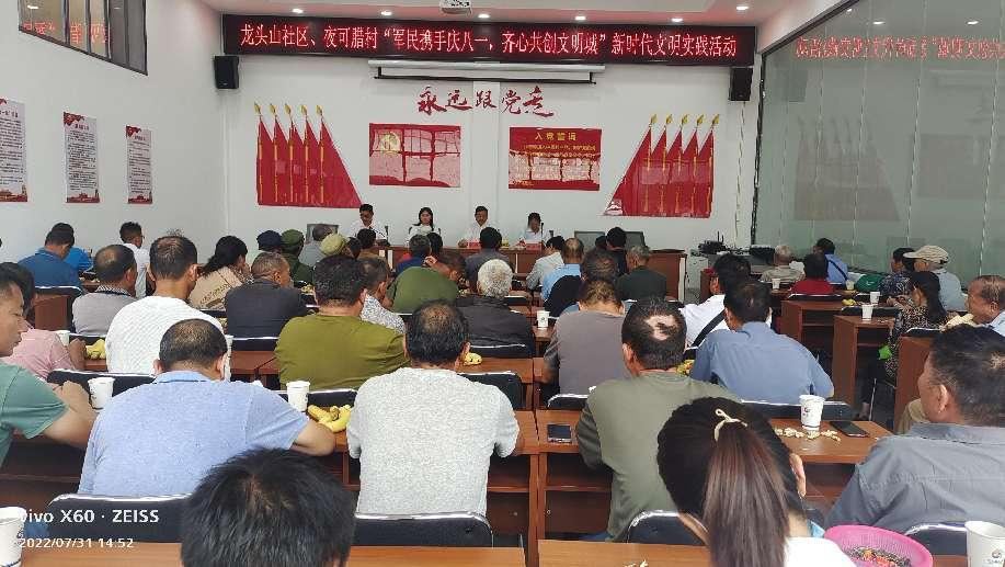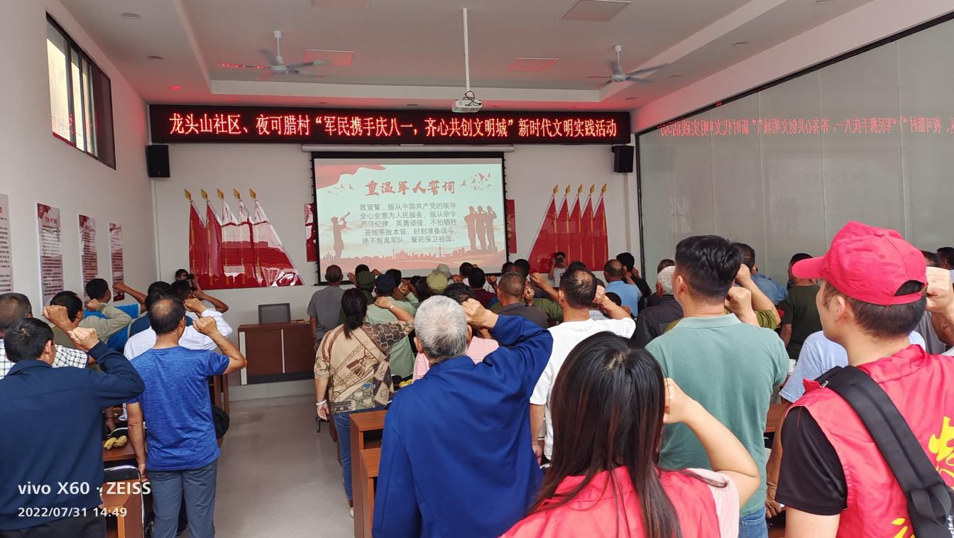 为迎接中国人民解放军建军95周年。大力弘扬社会主义核心价值观,讴歌人民解放军对伟大祖国和人民作出的丰功伟绩,培养社区居民的拥军意识和爱国情怀,引导辖区居民唱响时代主旋律,丰富居民群众精神文化生活,争创省级文明城市。永定镇龙头山社区携手维的乡夜可腊村委会共同开展了“军民携手庆八一、齐心共创文明村”新时代文明实践活动。