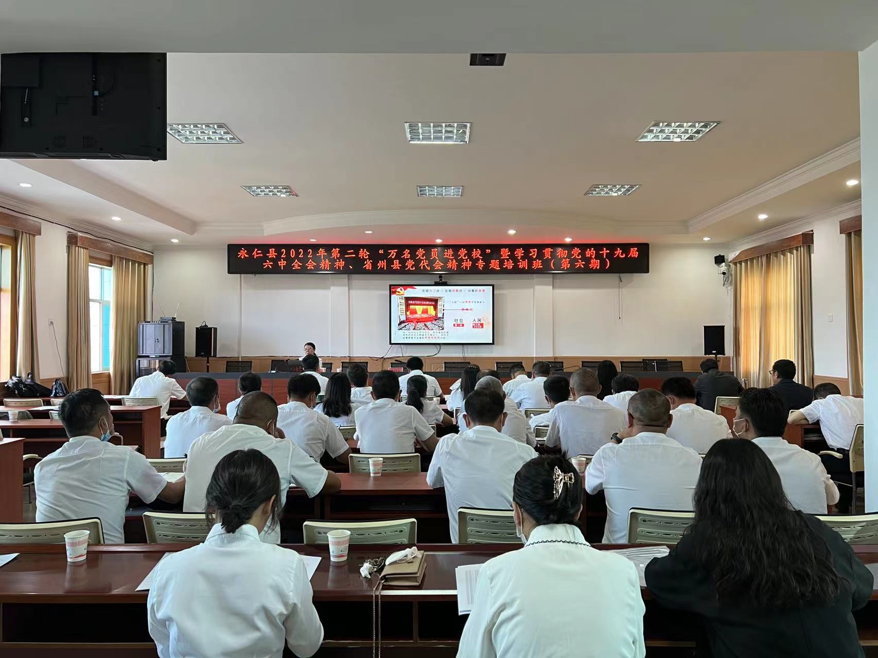 9月13日,永仁县2022年第二轮“万名党员进党校”暨学习贯彻党的十九届六中全会精神、省州县党代会精神专题培训班(第六期)暨永定镇“万名党员进党校”培训班在永定镇顺利开班,此次培训班采取“线上+线下”的方式开展,设置主会场1个,分会场12个,共628名机关党员及农村党员参加培训,通过现场授课和直播授课相结合的模式,让党员就近就便集中“充电”。