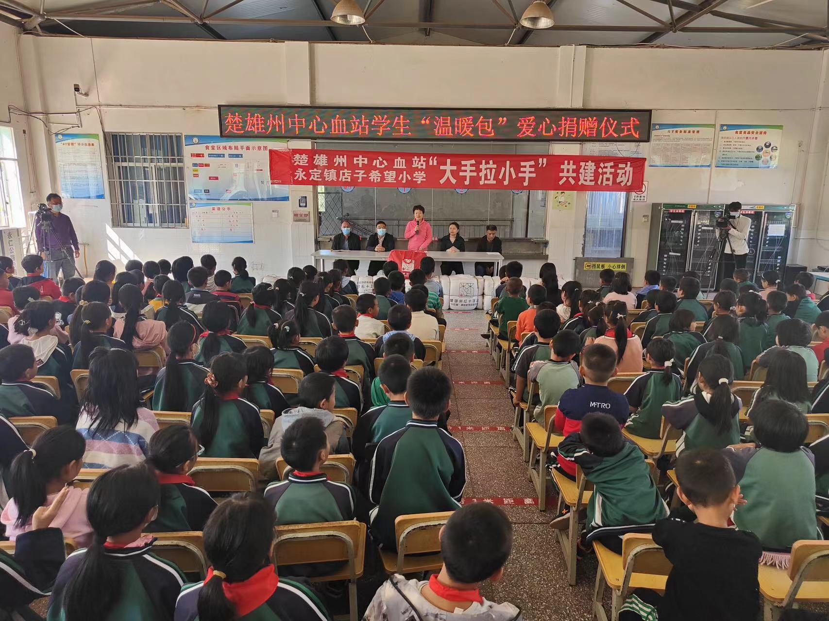 开展捐资助学活动。楚雄州中心血站向永定镇店子希望小学捐赠由楚雄州红十字会提供的价值1万余元的50套学生爱心“温暖包”。在捐赠仪式上,州中心血站党支部副书记、站长徐梅琼在讲话中强调,组织此次“温暖包”爱心捐赠活动,主要目的是传递各级党委、政府对教育事业的重视和支持,对学校师生的关怀和爱护,为同学们安心学习生活、积极获取知识提供力所能及的帮助。她深情勉励同学们要笑对生活、手捧希望、怀揣梦想、好好学习,用优异的成绩感恩父母,回报学校和老师,并希望店子小学桃李争妍,人才辈出,勇攀高峰!