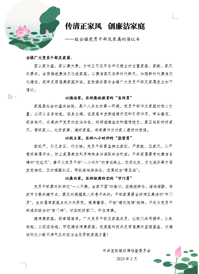 廉洁家风绘就清白人生底色。清廉家风倡议书号召全镇党员干部注重家庭、家教、家风建设,提升以德治家、以俭养家、以规立家的意识,弘扬传统家庭美德,涵养新时代良好家风。引导党员干部管好家人,树立清廉家风,筑牢反腐倡廉的思想堤坝,增强廉洁自律自觉,擦亮家风“小窗口”,做实廉洁“大文章”,警醒党员干部管好身边人身边事。