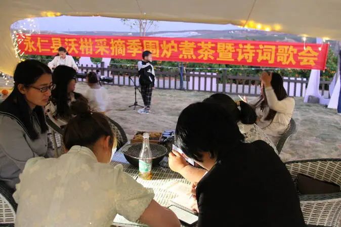 沃柑飘香挂满枝,煮茶吟诗话桑麻。4月7日晚,一场别开生面的围炉煮茶暨诗词歌会在永定镇麦拉村委会阳光生态花果园举行,不少诗词爱好者闻声而来。