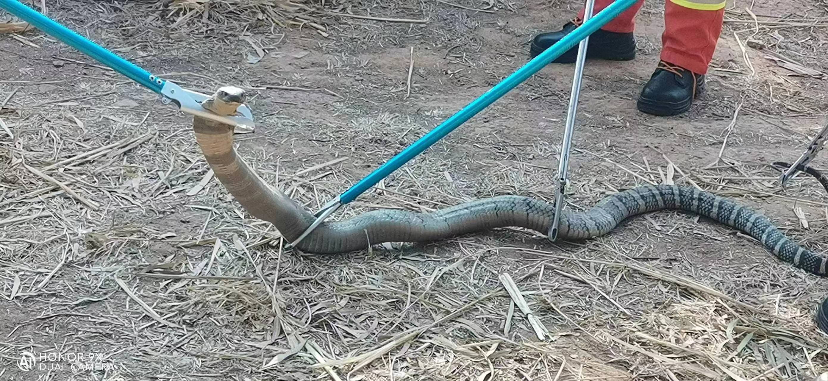 到达现场后,报警人员讲述,在劳作中发现有条大蛇盘踞在村民柴堆里,好像是眼镜蛇,觉得此蛇毒性较大,村民们人心惶惶,不敢处置,所以报了警。