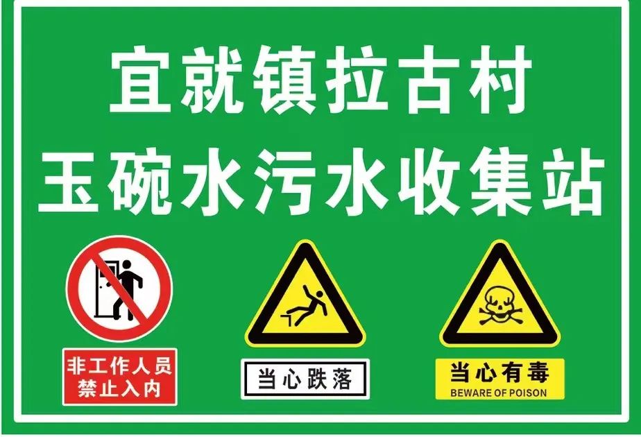 制定安装安全警示牌。按照“一池一牌”原则,对所有污水收集、处理站点安装警示牌,包括:站点名称及非工作人员严禁破坏、禁止入内、当心跌落、当心有毒4个警示标牌,提醒群众增强风险防范意识。