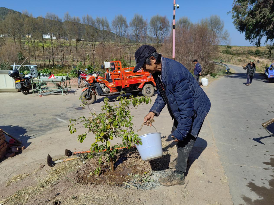有着53年党龄的老党员陈开兵已年过七旬,但他仍然积极践行自己的入党初心,紧紧跟着党旗,竭尽所能奉献自己的一份力量。“去年我们村的党员花了大力气一起把树种下的,必须把小树维护好,让小树过个“暖冬”,这些花花草草的形长好了,我们党员的“形”也就立起来了。”