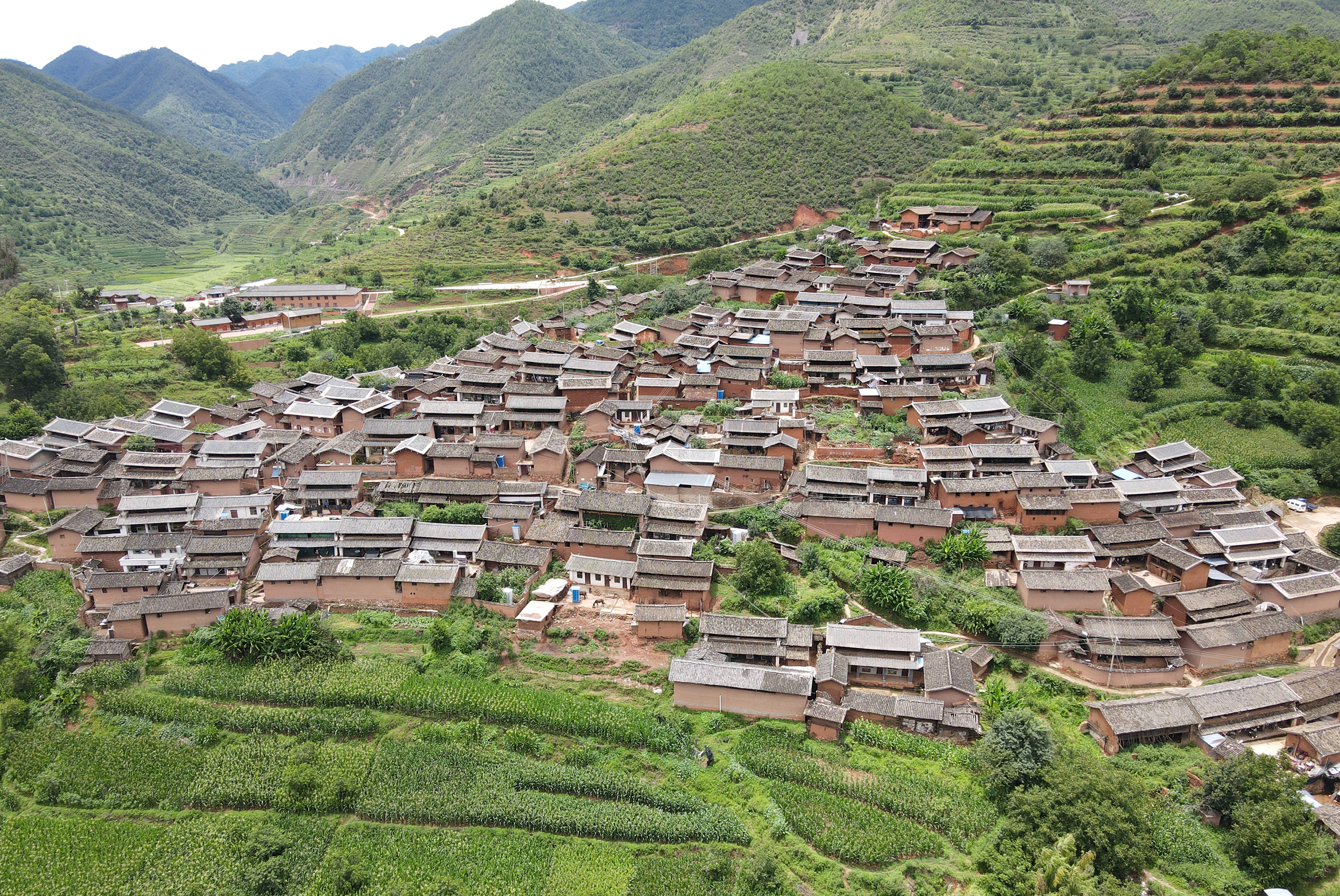 直苴村落主要是大村和小村两部分,一面靠山,三面临水,村庄依据山势,层层向上而建,村庄分布较为集中,石板铺地,蜿蜒的巷道连接每家每户。村庄内的民居建筑主要以土基房为主,村落整体风格统一,色彩和谐,是永仁县彝族土基房传承保护区。