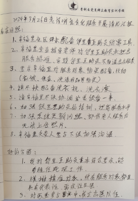 用心,让老年人享受‘老’幸福。宜就镇第一轮居家养老服务——老怀哨村站结束,村书记朱福翠在笔记本上记录下这项工作:2024年3月26日老怀哨村农村居家养老服务中存在8个问题,3个做得好的地方......,满满一页纸的笔记包含着对工作的认真,更包含着对老年人的关爱。
