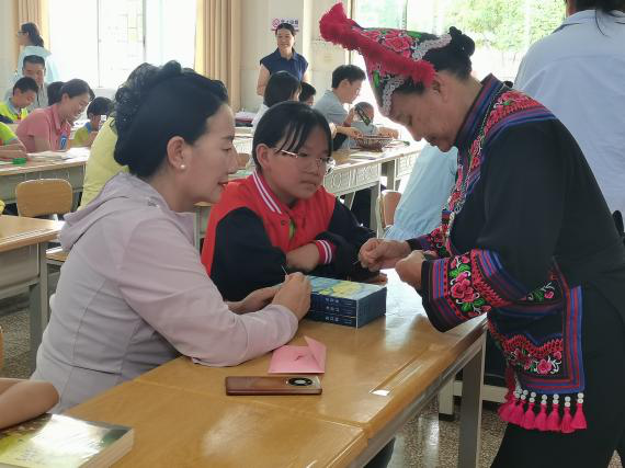 活动现场还邀请永仁县彝绣协会爱心妈妈团队,带着大家一起制作彝绣书签,让“爱心妈妈”和“爱心爸爸”在持续开展的合作性游戏中感情持续升温。