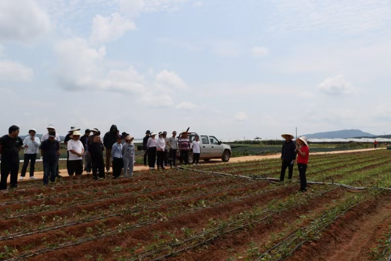 在猛虎坪子草莓地现场,参会人员参观了当地农户种植的草莓。来自中国农业科学院郑州果树研究所的副研究员李刚现场为大家讲解了草莓病虫害防治等相关知识,并现场查看了草莓的苗情长势,解答了部分参会人员提出的问题。