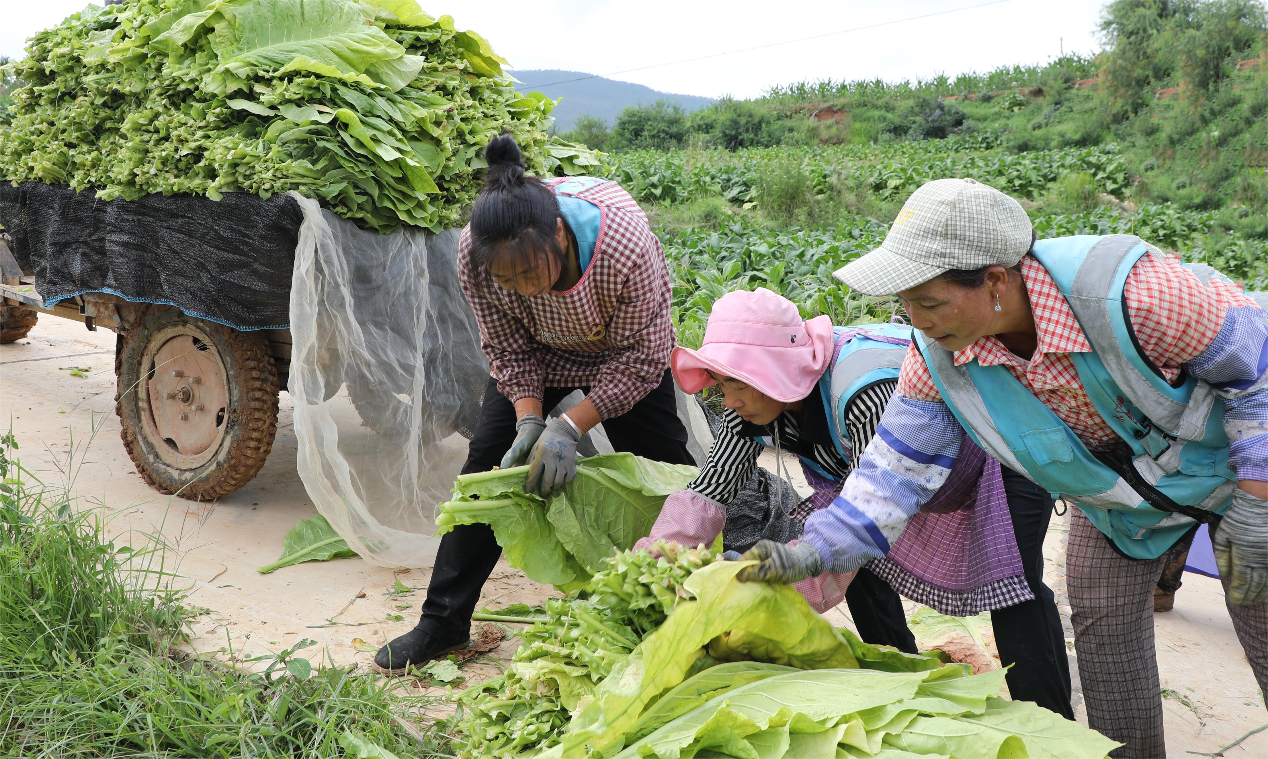 在维的乡桃苴村烤烟种植户罗永芹的烟叶地里,连片种植的7亩烤烟长势喜人,最近他家以一炉烟1500元的价格下单了“幸福里”烟草版采、编、装套餐服务,现场一排排“蓝色马甲”幸福里产业工人正热火朝天地穿梭在烟叶地里采收成熟的烟叶,搬运、编烟、上烤……忙碌的身影形成田间地头最美的风景。