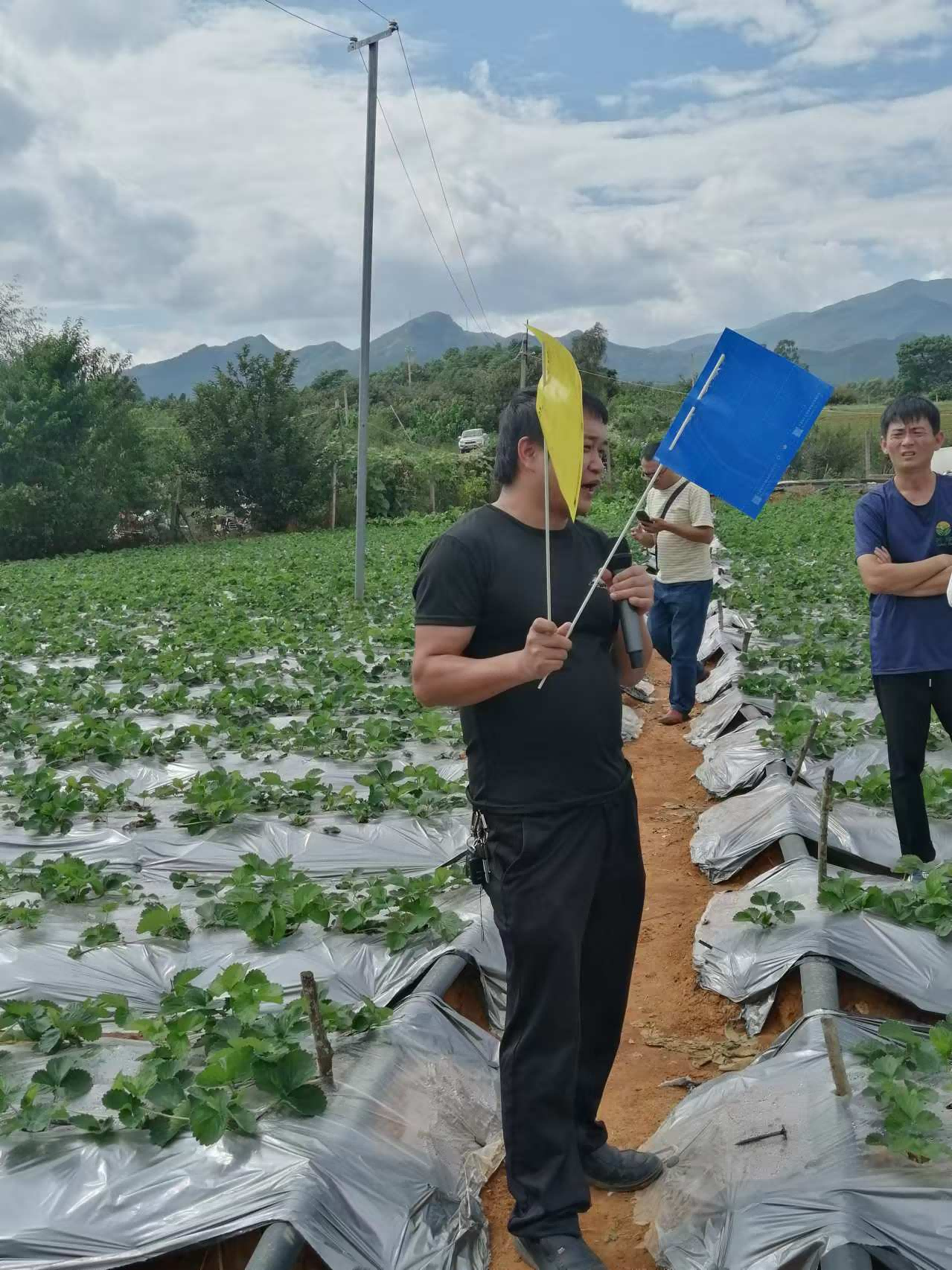 此外农业农村发展服务中心主任还为种植户讲解了悬挂黄板是通过在草莓田间悬挂黄色粘虫板,利用蚜虫、粉虱等害虫对黄色的趋性进行诱杀,悬挂蓝板是针对蓟马等害虫,使用蓝色粘虫板进行诱杀的防虫害原理。并且告知种植户每亩使用50张黄蓝板,黄板、蓝板各25张,黄蓝板要交错间隔3-5米使用,隔沟插放,控制密度,尽量减少化学农药的使用,降低对环境的污染,这样不仅能提高草莓的品质和安全性,还能满足消费者对绿色食品的需求。