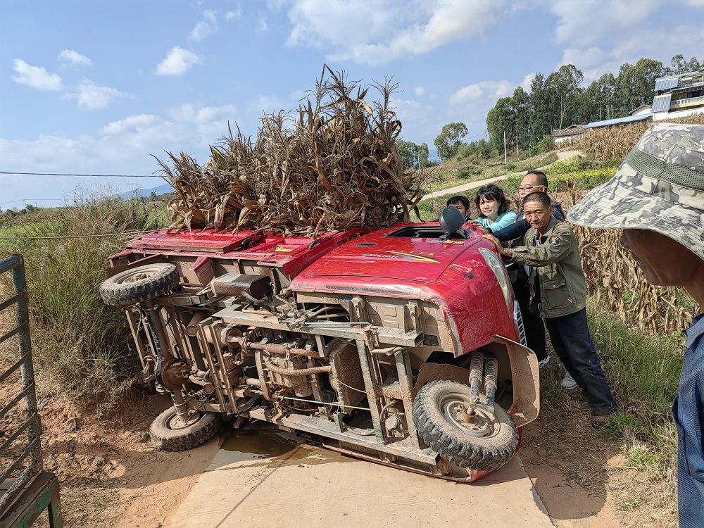 事故现场,三轮车驾驶员已从驾驶舱中安全脱身,自身未受伤,但迟迟无法将侧翻的三轮车推起,驾驶员联系了附近的群众,大保关下村热心群众起荣贵、起天学开着拖拉机来到了现场,在众人的共同努力下终于将三轮车扶正,扶正后,殷顺泽、薛明方帮助驾驶员稳住车身,防止三轮车落入农田中发生二次事故。