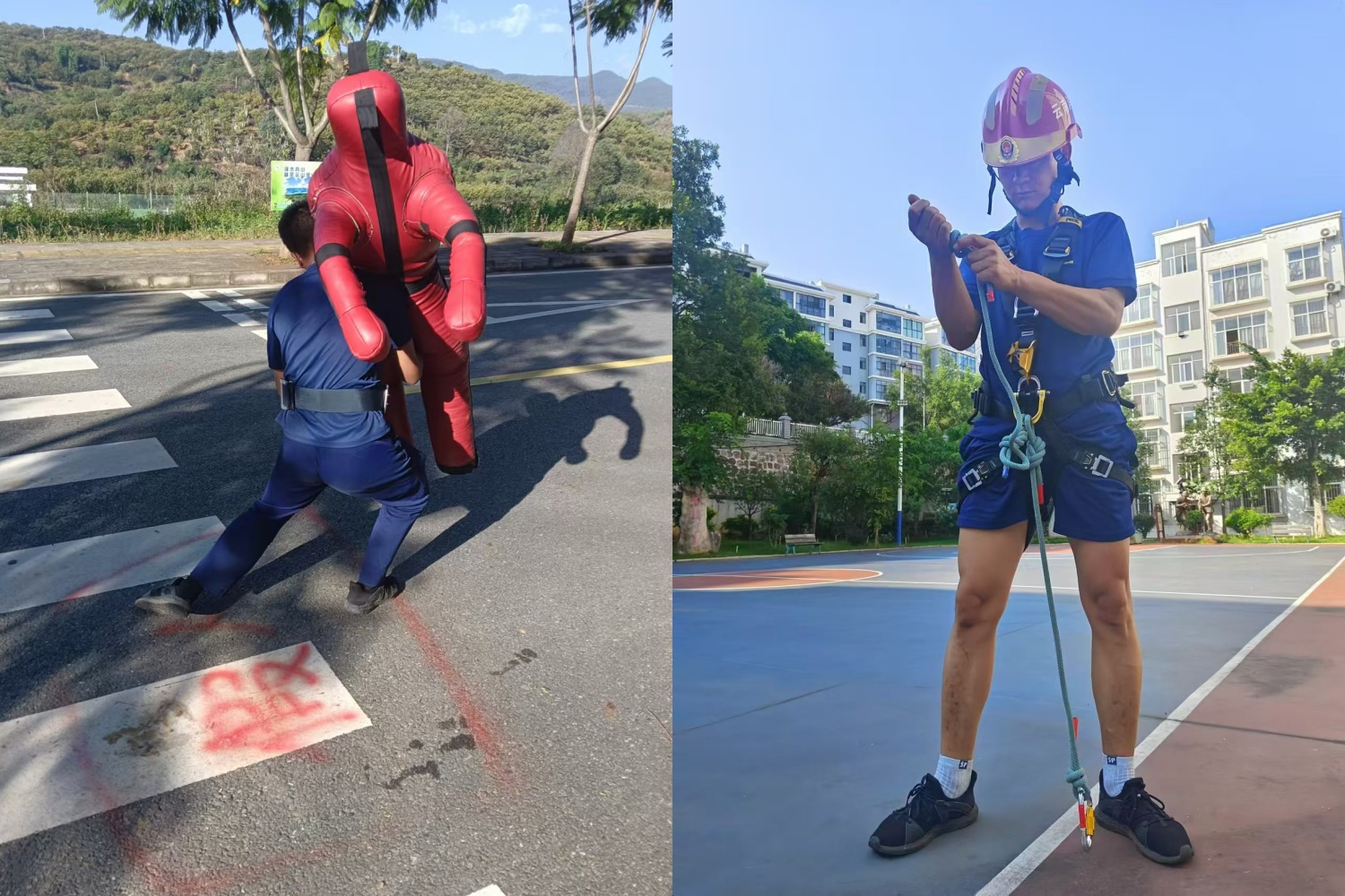 以训促能,铸就钢铁意志。“我们的训练是全方位的,从体能到技能,从理论到实践,每一个环节都至关重要。只有通过严格的日常训练,才能在关键时刻发挥出救援队的作用。”维的乡综合应急救援队队长杨晓俊的话语中透露出坚定与决心。每天清晨,当第一缕阳光洒满大地,响亮的集合号令便划破宁静,队员们便开始了紧张而有序的体能训练。跑步、力量训练、耐力训练……每一项都是对极限的挑战,每一项都是为了在救援现场能够如磐石般坚不可摧,保持充沛的体力和耐力。同时,技能训练更是他们的“看家本领”,从每日雷打不动的3公里早操,到周而复始的综合体能与装备操作训练,再到技术操作及负重耐力的专项训练,他们用行动诠释着对专业技能的极致追求。