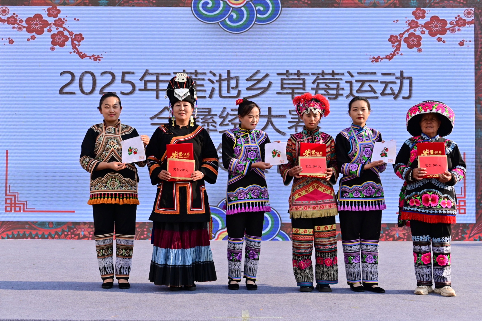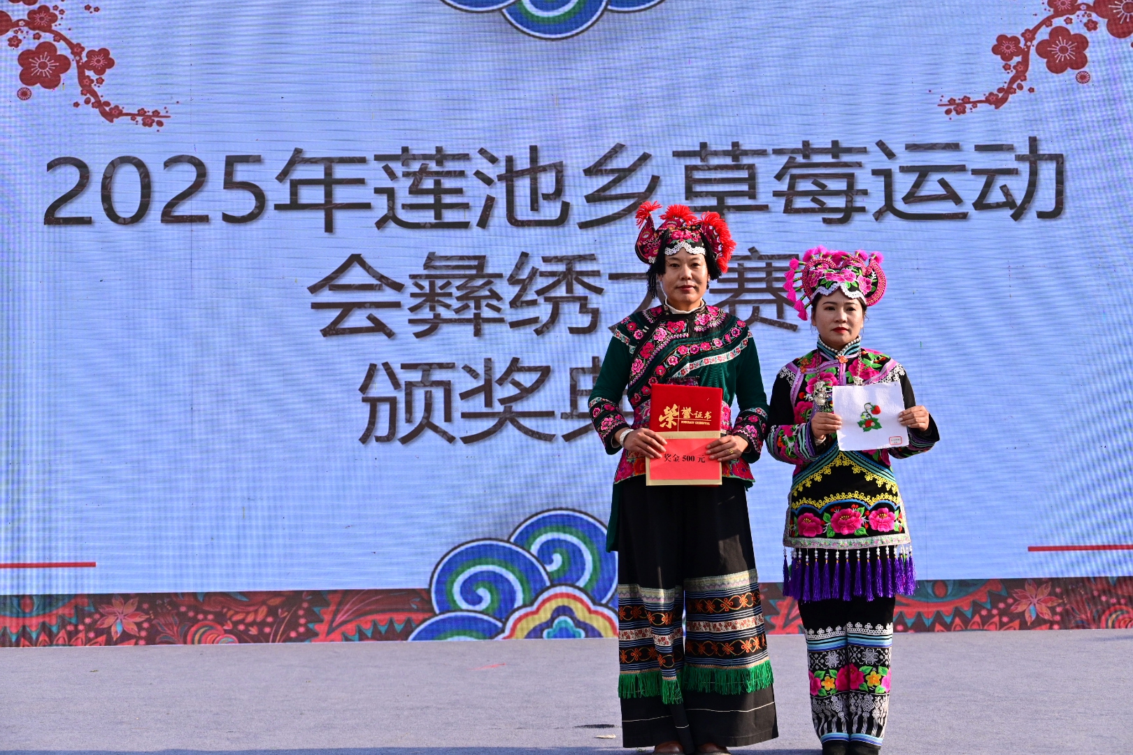 “草莓”主题的彝绣大赛在传承和弘扬彝族刺绣这一非物质文化遗产的同时加入了莲池特色产业元素,20名参赛绣娘现场飞针走线,彩色丝线在她们手中穿梭自如,不一会儿,一颗颗、一簇簇鲜草莓便跃然布上。经过评委们从色彩搭配、针法运用、做工等等多方面的严格评审,最终个人一等奖1名、二等奖2名、三等奖3名,优秀奖14名。颁奖仪式上,获奖选手们手捧证书和奖金,脸上洋溢着自豪的笑容,台下响起了热烈的掌声。
