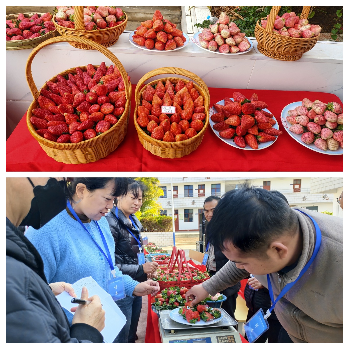 本次活动吸引了来自全乡11个草莓种植户踊跃参与,参赛农户带来了香野、粉玉、黑珍珠、章姬等多个深受消费者喜欢的品种,一篮篮饱满鲜亮的草莓,让现场弥漫着紧张的竞争气氛。评委对参赛草莓进行了硬度、糖度、单果重量、着色面积、果面光洁度、色泽口感等指标检测,经过认真称重、仔细品尝、观果查色后分别计分、汇总,围绕建设主体规模、农产品质量安全规范、绿色生产与产品质量、市场认可与联农带农机制、自身创新能力和带动能力、农残、口感等指标,最终从参赛样品中评选出金奖1名,银奖2名,铜奖3名。永仁宏鑫草莓种植专业合作社带来的香野凭借超大个头、鲜亮色泽和清甜多汁的口感摘得“金果王”桂冠。