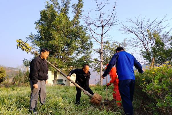 在植树现场,党员干部、青年志愿者们热情高涨、干劲十足、相互协作,一起分发树苗、挥锹铲土、扶树填坑、踏土夯苗、提桶浇水,共同栽植新绿。植树间隙,干部职工互相交流,仔细询问树木品种、植树面积、后续养护等问题,大家以“绿色接力”赋能,用实干之姿书写生态文明新答卷。转眼间,一株株新栽的树苗错落有致、迎风挺立,为乡村振兴注入盎然生机。