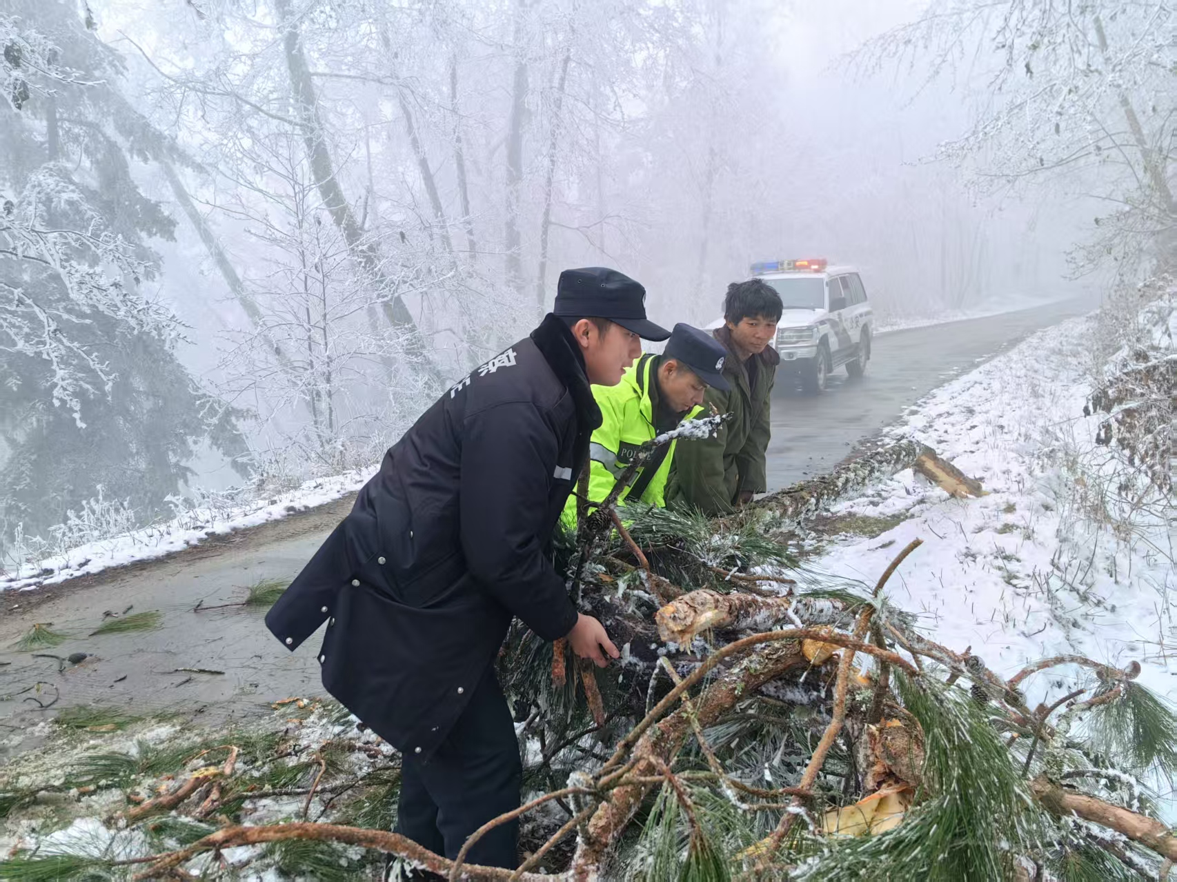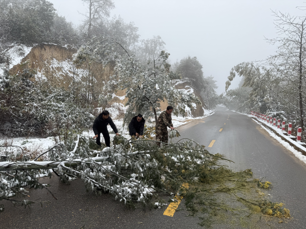 为保障群众出行安全,永兴傣族乡党员干部、公安派出所民警,以“雪”为令,闻“雪”而动,始终以“等不起”的紧迫感、“慢不得”的危机感,“坐不住”的责任感,快速行动,冒着严寒,深入到积雪严重的道路,开展道路安全疏导、齐心协力徒手将断木树枝清理移除至不影响交通的空旷区域,成功消除了安全隐患,及时使路面恢复正常,在寒冷中为出行者们带来了一股股暖流。