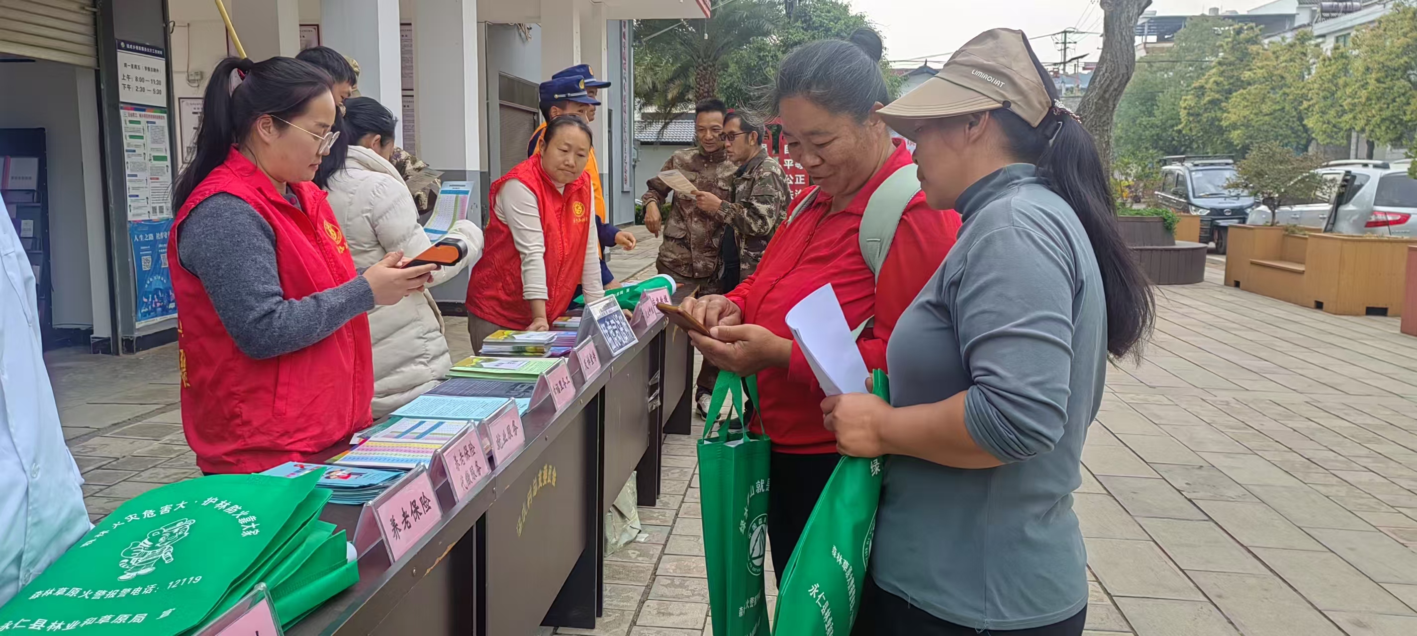 政策宣传惠民生,安全意识入人心。活动当天,依托猛虎街子天群众接送学生的时机,志愿者通过发放宣传页、现场答疑等形式,向群众普及森林草原防灭火、防范电信诈骗、法律知识、交通安全及消防安全等政策法规,累计发放宣传资料540余份。