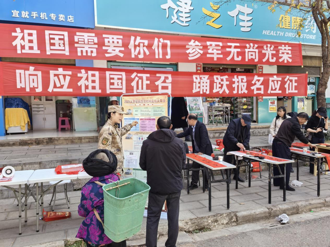 结合宜就镇实际,巧用“传统+新媒体”双轮驱动,一方面,利用集镇赶集日开展征兵政策宣传活动,通过悬挂横幅、设置咨询台、发放宣传手册等形式,吸引群众驻足参与,累计发放资料300余份,覆盖群众100余人次;另一方面,依托集镇电子大屏播放征兵系列专题短视频、利用公众号发布征兵宣传信息,激发青年“携笔从戎、报效祖国”的热情。