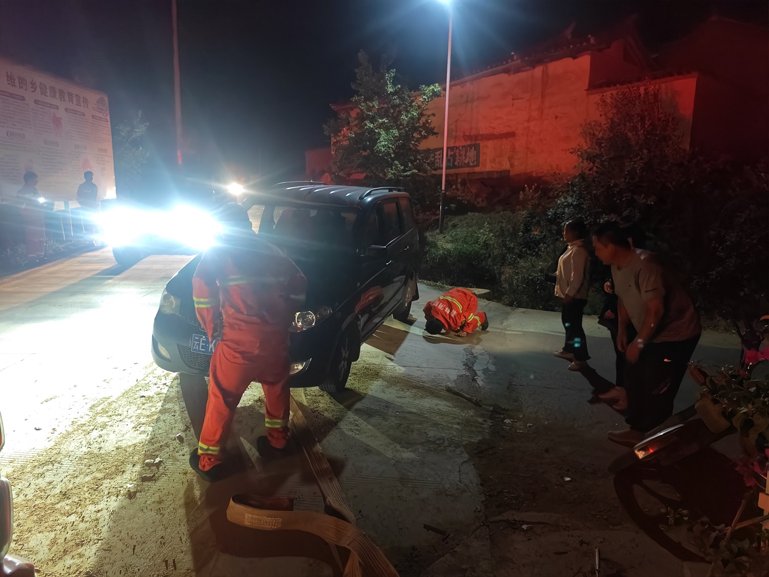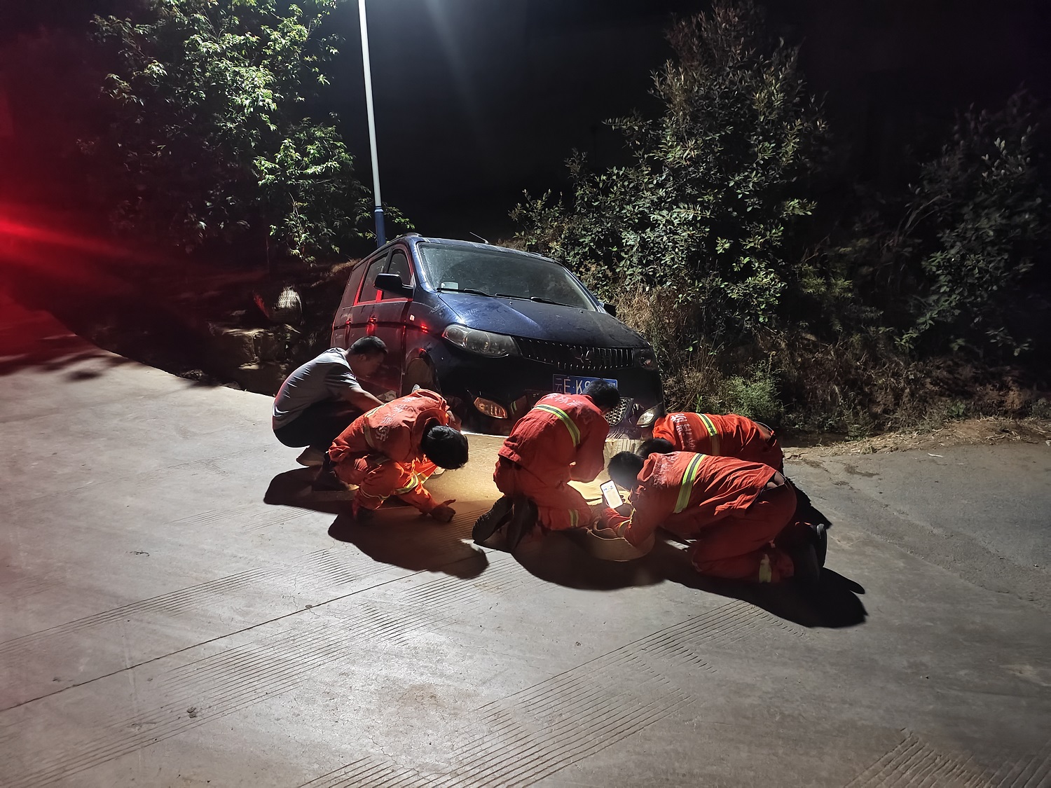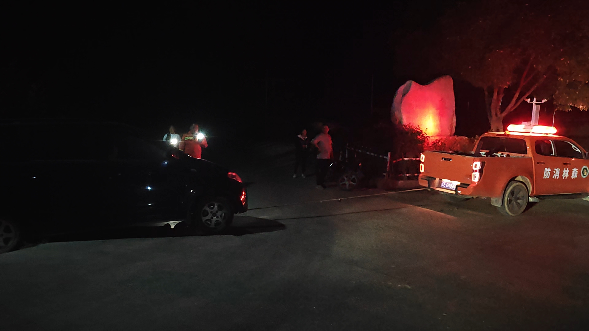 受困司乘人员已在黑暗中等待近30分钟,发现亮着警灯的森林消防巡查车后激动呼救。带队组长立即启动应急预案,消防队员分两组展开处置:警戒组使用爆闪警灯实施交通管制,在弯道两端设置警示区;技术处置组俯身勘察,发现车辆未见明显受损,油箱未见泄漏。附近闻讯赶来的村干部也一同加入救援工作。