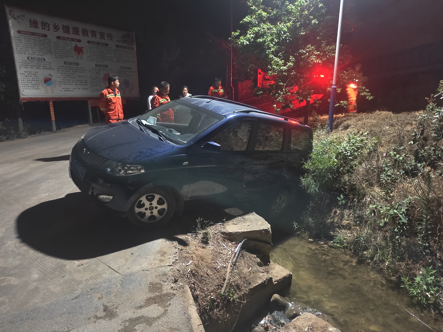 4月29日晚10时,维的乡半专业森林草原消防队在执行防火巡查任务时,突遇紧急救援事件。巡查车辆行至的鲁村的鲁丫口急弯时,发现一辆小客车因路况不熟冲出路面,右前轮及双后轮悬空卡于排水沟,车身倾斜近40度,存在侧翻危险。