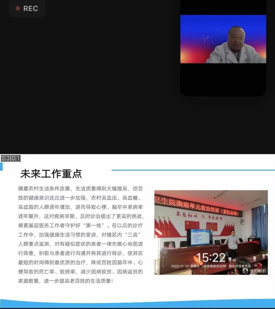通过为期一年的努力,永定镇卫生院胸痛救治工作得到县胸痛中心的认可,并将村级救治经验逐层上报到胸痛中心联盟总部。12月9日,永定镇卫生院麦拉村委会卫生室的周道武医生受邀做村救治点工作分享。与会期间,周道武医生就村胸痛救治工作基本情况、案例分享及未来工作展望三个方面做了分享,受到参会专家的肯定与高度评价。