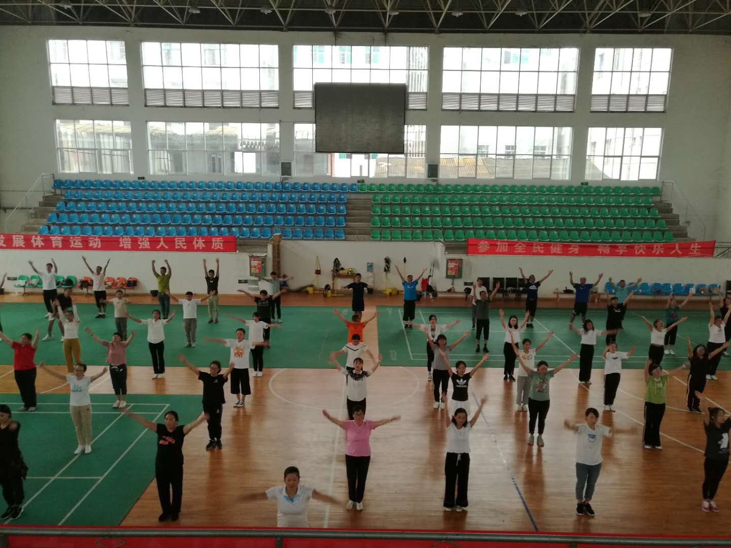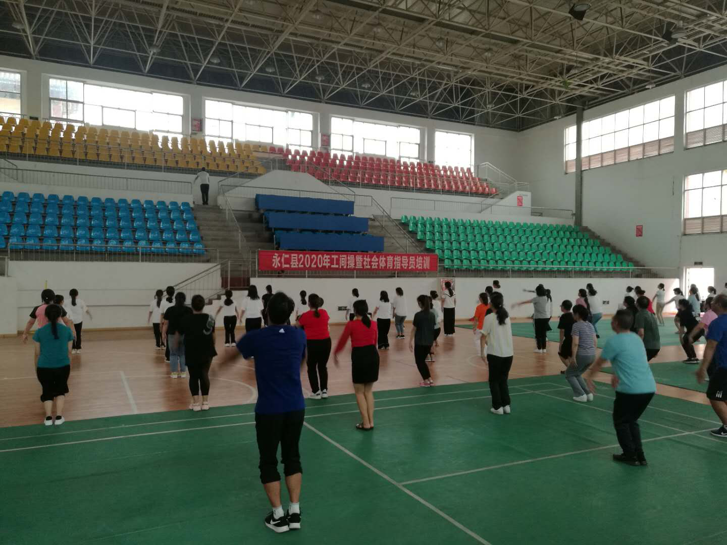 为贯彻落实习近平总书记在十九大报告中提出的“广泛开展全民健身活动,加快推进体育强国建设”指示精神,落实永仁县《全民健身计划(2016-2020年)》,增强全民健身意识,提高干部职工健康素质,营造“快乐工作、健康生活”的理念,近期,永仁县教育体育局在体育馆组织了县级机关事业单位工间操暨第九套广播体操培训,共 74个单位, 97人参加了培训。