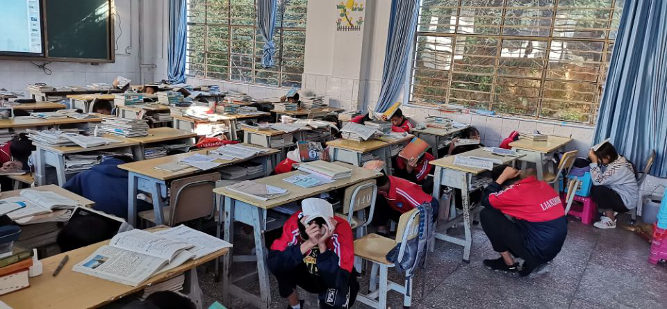 上午进行教室地震逃生演练,当警报响起时,各班学生都有序地躲在桌子底下模拟地震现场演练,用书本护住头部有序撤离。