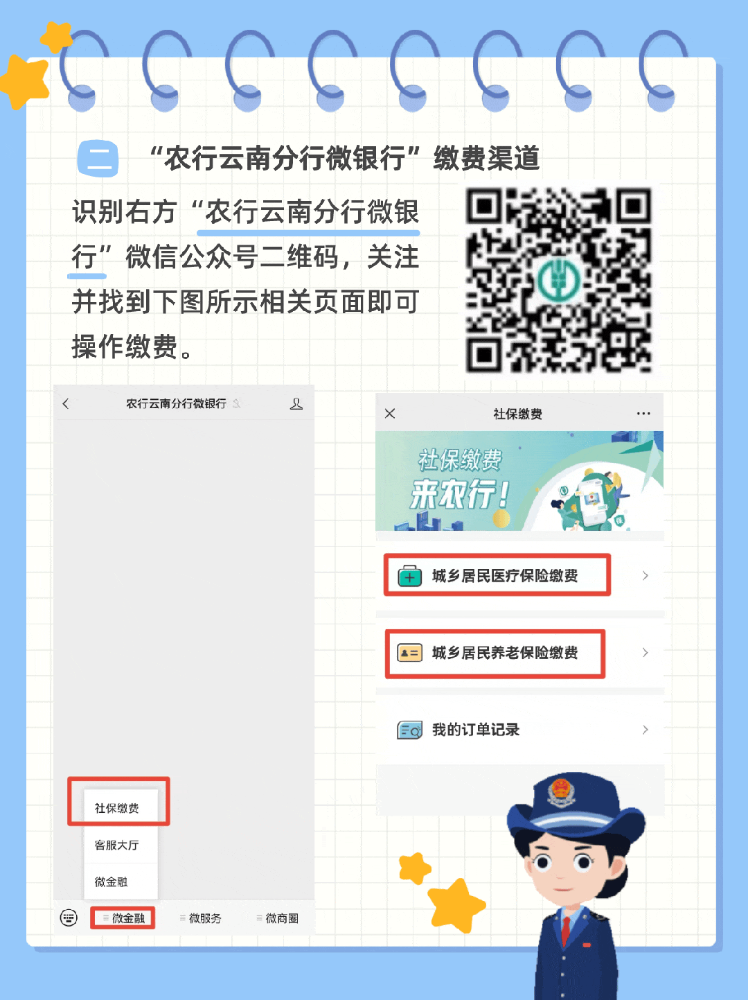2.银行网点代征:缴费人携带户口本或身份证、银行卡到农信社或农业银行网点,由银行工作人员柜面办理缴费,或在自助终端机上自行操作缴费。