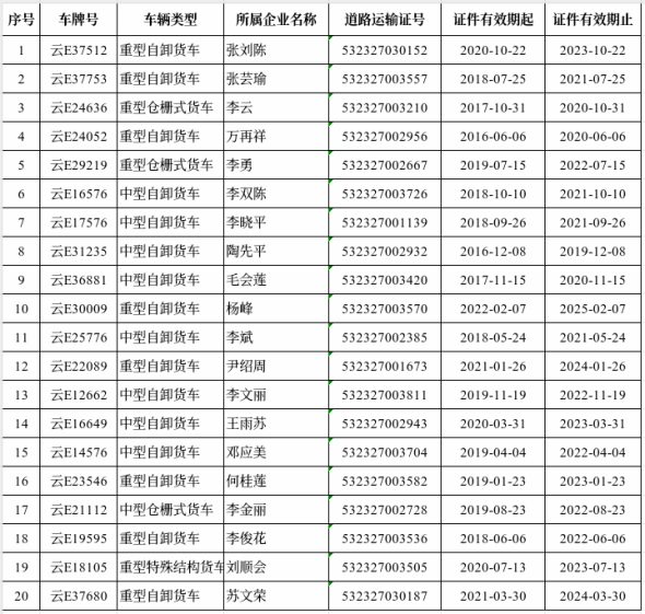 现对该批车辆信息予以公示,公示期为15个工作日,自2025年11月25日起至2025年12月15日止。公示期满后将对其《道路运输证》予以注销,在公示期间内,我单位仍然受理该批车辆的年度审验办理手续,请各经营户按照规定时间到永仁县政务服务中心交通运输窗口(地址:永仁县永定镇广场路9号永仁县人民政府政务服务中心二楼62-67号窗口)办理车辆年度审验业务。