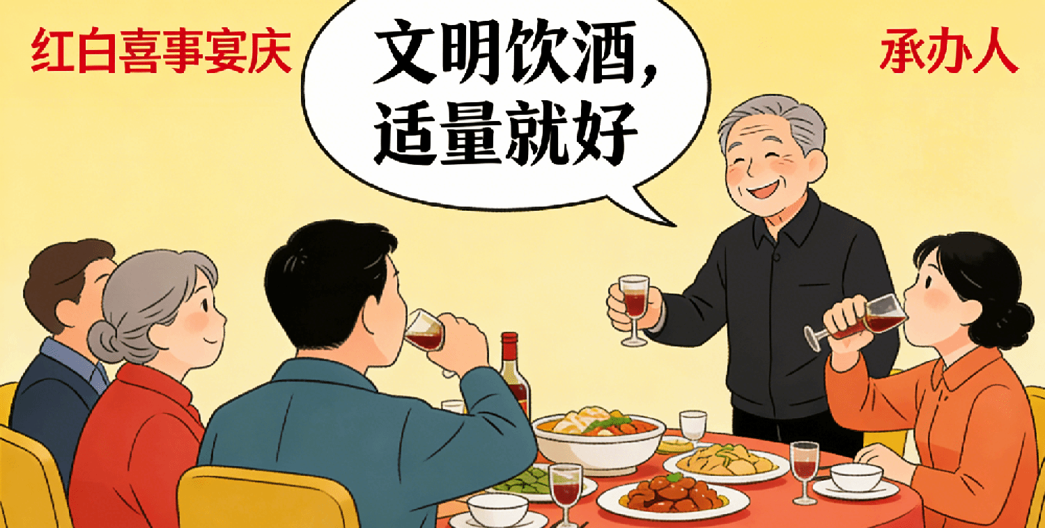 一、红白事宴请,把好“文明酒” 关。办理红白喜事等集中宴请时,承办人要主动承担起管酒控酒的主体责任,挑选1-2名细心负责的人员全程协助管酒,耐心提醒宾客适量饮酒、文明劝酒,坚决杜绝强行劝酒、斗酒、灌酒等不良行为。同时,密切关注宴请现场氛围,及时管控潜在矛盾纠纷,若遇突发情况,第一时间妥善处置。