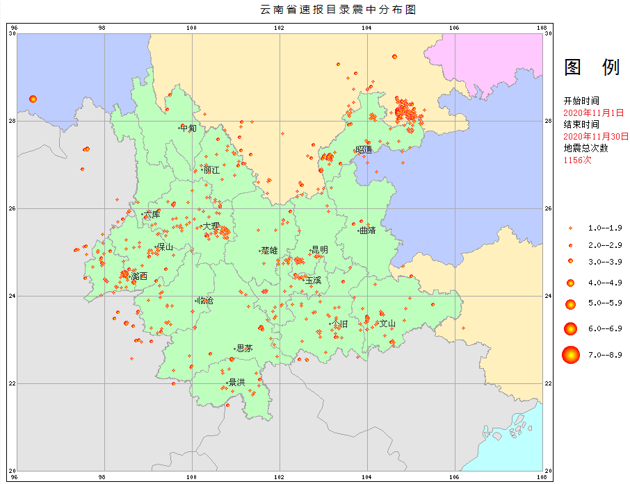 来自云南省地震台网地震目录快报统计,11月1日~30日23时30分云南地区发生1.0级以上地震1156次,其中: 1.0~1.9级983次,2.0~2.9级157次,3.0~3.9级15次,4.0~4.9级1次,5.0~5.9级0次,无6.0级以上地震发生,地震活动主要分布在巧家、洱源、易门、景洪、永善、永胜、永德、祥云、施甸、盐津、文山、保山、巍山、砚山、威信、凤庆、大姚、大理、新平、金平、石林、石屏、华宁、安宁、昌宁、晋宁、宁蒗、元谋、元江、丽江、墨江、盈江、双江、江城、马关、镇雄、镇沅、镇康、个旧、牟定、玉溪、玉龙、云龙、龙陵、陇川、剑川、宾川、东川、会泽、耿马、广南、腾冲、楚雄、漾濞、武定、禄丰、禄春、禄劝、双柏、勐腊、临翔、临沧、澜沧、沧源、弥渡、沾益、芒市、泸水、建水、昆明、元阳、香格里拉、蒙自、呈贡、通海、昭通、麻栗坡、西畴、丘北、富民、彝良、瑞丽、普洱、华坪、思茅等地。11月1日以来楚雄地区小震有所活动,至30日发生1.0级以上地震活动42次,其中:1.0~1.9级41次,2.0~2.9级1次,3.0~3.9级0次,4.0~4.9级0次,无5.0级以上地震发生,空间上主要分布在双柏、禄丰、元谋、楚雄、武定、牟定、大姚等地。永仁境内11月小震活动平静,未发生1.0级以上小震活动。