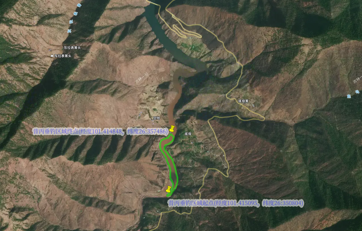 2.拉姑村委会丙令河口(经度101.442780,纬度26.401548)至那干得沟(经度101.446525,纬度26.412482)。