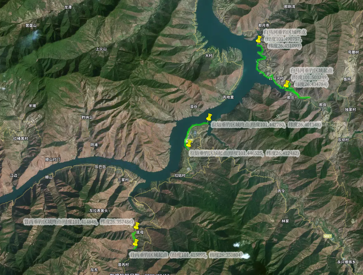 根据《云南省农业农村厅关于规范云南省长江流域禁捕水域垂钓管理的通告》(云农通告〔2021〕第28号)、《楚雄州农业农村局关于规范楚雄州金沙江流域禁捕水域垂钓管理的通告》(楚农通〔2022〕第11号)、《云南省农业农村厅关于楚雄州大姚县等3县市金沙江流域禁捕水域垂钓区域和时间范围划定的批复》、《楚雄州农业农村局关于永仁县金沙江流域禁捕水域垂钓区域和时间范围划定的通知》,为进一步保护水域生态环境和渔业资源,维护禁捕管理秩序,规范广大人民群众休闲垂钓行为,结合实际水域情况,现将休闲垂钓区域向社会公布。