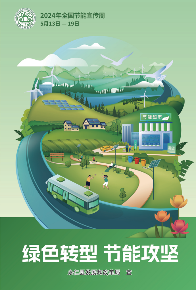 2024年5月13日至19日是第34个全国节能宣传周,今年的活动主题是绿色转型、节能攻坚,积极稳妥推进碳达峰、碳中和,加强重点领域节能降碳。推动大规模设备更新和消费品以旧换新,加快构建新发展格局。积极推广节能降碳技术和装备,全面推动企业绿色发展。选购节能高效家用电器和绿色低碳住宅,积极营造全社会简约适度、绿色低碳的生活方式,选择丰富。交通工具以实际行动践行绿色出行,节粮、节水、节电,禁止使用不可降解塑料袋和一次性餐具,倡导绿色低碳生活,小举措也能释放大能量。让我们积极行动起来,为建设绿美云南贡献力量,绿色转型节能空间。