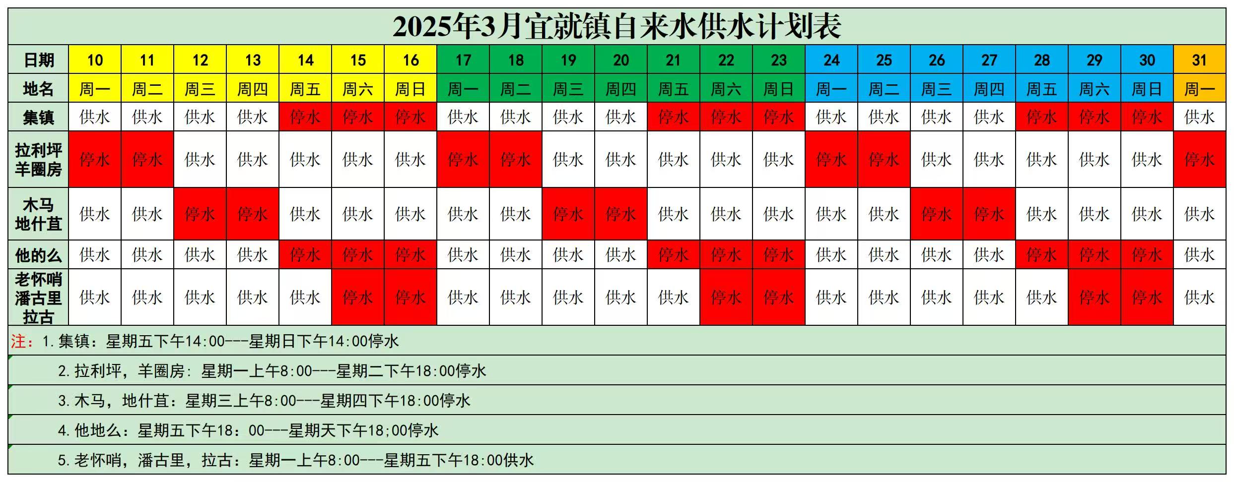 附件:2025年3月宜就镇自来水供水计划表