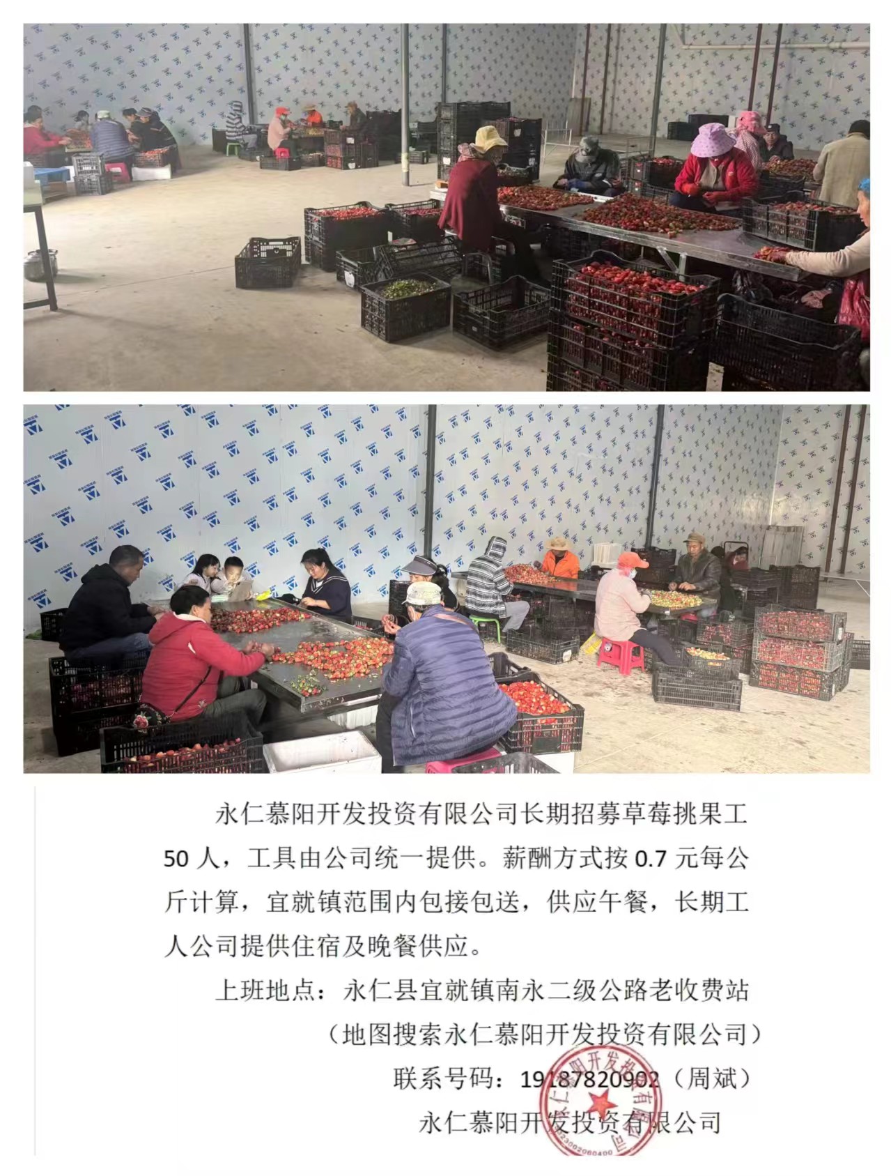 由慕阳投资开发有限公司牵头开展草莓尾果收购、宣传、招工、加工,每日收果约10吨,招工50余人,每天每人收入120元,每日提供一餐(午餐)。在慕阳投资开发有限公司务工的周大姐说:“我们村一共来了6个人,负责分拣、包装,都干了一个月了,每天能拿120元的工资,还包午餐,实现了离家近又有收入啊”。
