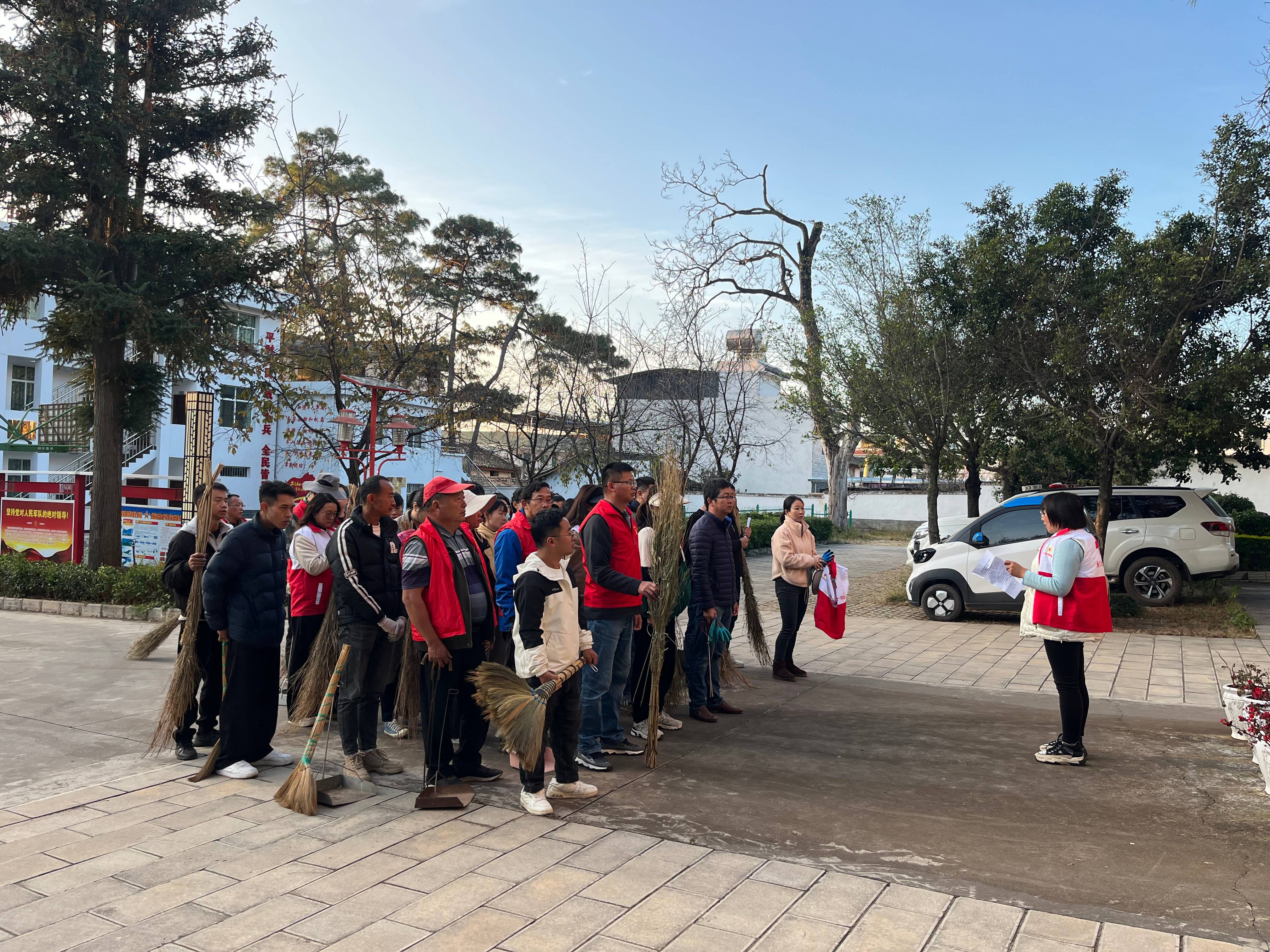 上午八时,志愿者带着扫帚、镰刀、锄头、火钳等保洁工具,集中认领任务。进行简单分工后,3个组的志愿者分头开始清理集镇区。在街道两侧,大家为行道树修枝整型,清走树枝,并将树干涂上石灰,防止虫害。在街边花园,大家认真清除杂草、清理白色垃圾。在各商铺门前,相关工作人员一一上门收取垃圾清运费。整个活动中,大家积极号召个体经营户也参与卫生整治,清扫卫生死角。