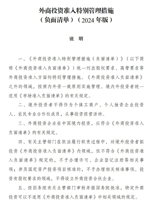 经党中央、国务院同意,国家发展改革委、商务部于2024年9月8日发布第23号令,全文发布《外商投资准入特别管理措施(负面清单)(2024年版)》,自2024年11月1日起施行。《外商投资准入特别管理措施(负面清单)(2021年版)》同时废止。