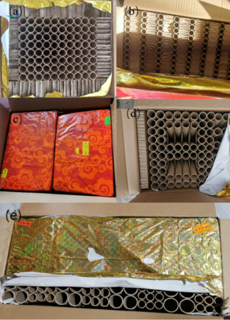 (2)属于不合格产品的几种组合烟花:凡是通过在包装内加垫板、在烟花筒间加隔板来撑大包装的,均属于“假大空”烟花;私自用引线将两盆或以上烟花连成一体的;组合烟花产品的筒体呈扇形排布的;烟花筒内径大于30毫米的。(如图2所示)