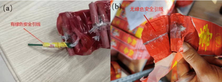 (1)请务必认准绿色安全引线。未安装绿色引线的产品不合格,其引燃时间极短,燃放时危险性很高,请勿购买。(如图1所示)