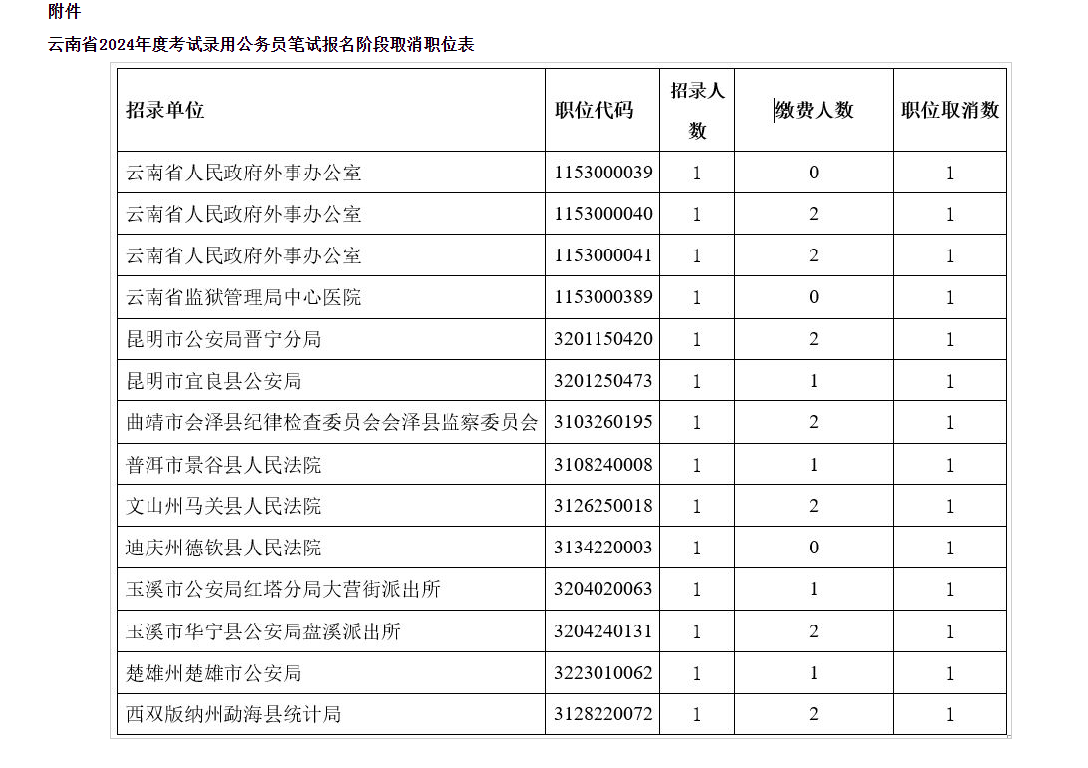 附件:云南省2024年度考试录用公务员笔试报名阶段取消职位表