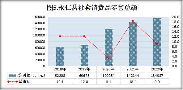全年实现社会消费品零售总额154937万元,同比增长9%。分城乡看:城镇实现105908万元,同比增长8.5%;乡村实现49029万元,同比增长10.1%。分经济类型看:非公有制经济实现153946万元,同比增长9%,非公有制经济实现的消费品零售额占99.4%;公有制经济实现991万元,同比增长3.3%。按行业划分看:批发业13753万元,同比增长8.1%;零售业118542万元,同比增长9%;住宿业3895万元,同比增长7.6%;餐饮业18747万元,同比增长10.2%。