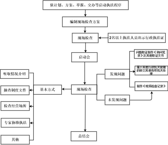 编制现场检查方案——现场检查——制作现场检查记录—(发现问题)制作询问笔录及其他文书